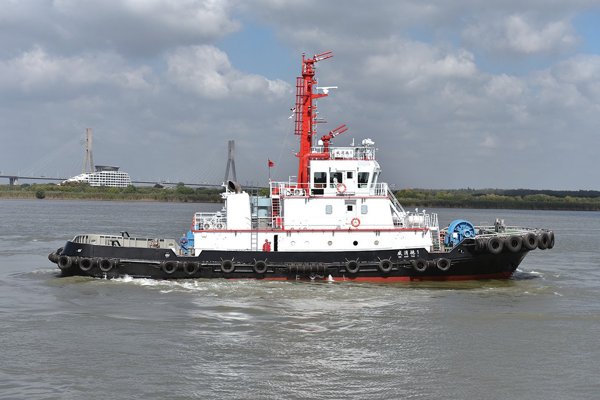 公司新造5600马力“威消拖1”轮于2022年9月投入使用,是经CCS船级社审图、认可,具有FIFI-I消防功能、带有尾拖机的全回转入级消防拖轮,拖力可达到62吨,在125米的有效射程内每小时出水量达到2800立方。此拖轮是威海辖区第一条CCS船级社检验、入级的消防拖轮。投入使用后,有效缓解了威海辖区内没有正规海上消防拖轮的局面,有力提升了威海辖区处置海上突发事件的应急能力,能够为每年威海辖区十余万艘过境及进出船舶提供必要的安全保障。